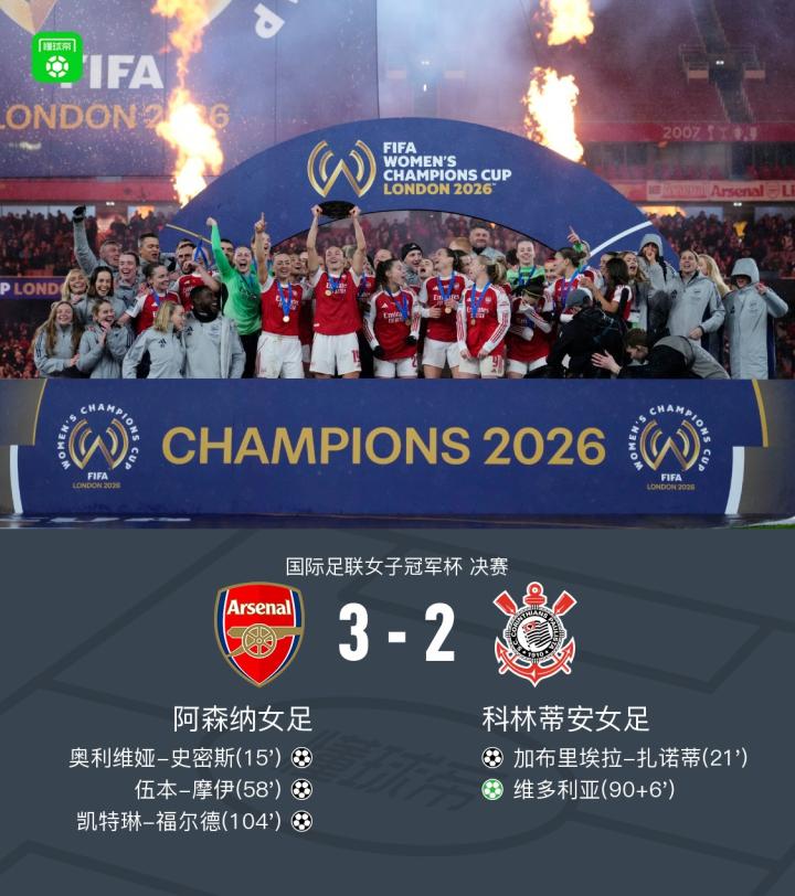 在加时赛的第104分钟,阿森纳女足再次取得领先,马阿努姆助攻凯特琳-福尔德打入一球,帮助球队再次反超比分。阿森纳女足的球员们展现出了顽强的意志和出色的球技,坚持到最后一刻,最终以3-2战胜科林蒂安女足,夺得了国际足联女子冠军杯的冠军。这场比赛充分展现了女子足球比赛的精彩和激烈,为观众带来了一场难忘的比赛。